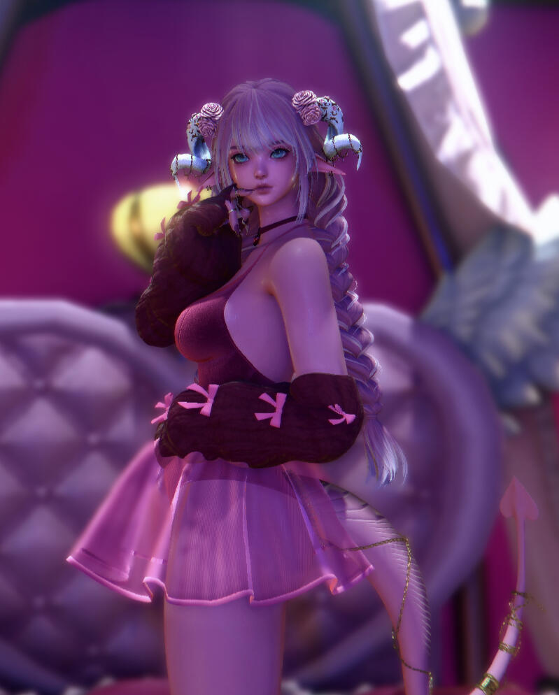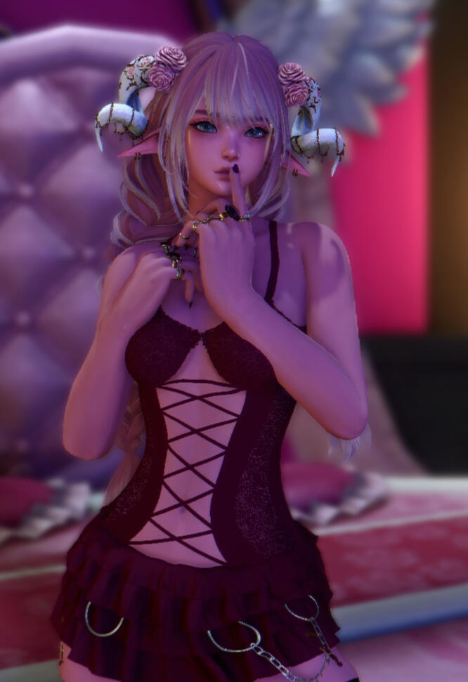SUGAR SPICE && EVERYTHING NICEHime’s life began in darkness, a succubus born of the void and bound to an endless cycle of servitude to greater voidsent masters. For centuries, she longed for freedom, plotting her escape from the oppressive bonds of her existence. Her chance came when she slipped through a tear between realms, fleeing to the mortal world and assuming the guise of a Veena Viera child. In the dense forests of the Skatay Range, she was taken in by a kind-hearted tribe, her voidsent origins hidden beneath the gentle, mortal appearance of a reclusive Veena. For a time, she believed she had found a haven, a new life free of the void’s clutches.But her peace was not to last. Someone from outside the tribe discovered the truth of her nature—a predator who saw not a person, but an opportunity. Betrayed by one she trusted, Hime was sold into a notorious brothel known for shaping its courtesans into both alluring companions and deadly tools. Stripped of choice and innocence, she was trained in the arts of seduction, performance, and assassination. Her otherworldly beauty and voidsent charisma made her a favorite among elite patrons, but beneath the veneer of elegance and poise, her fury at her captors grew.Years later, that fury reached its breaking point. When the brothel’s owners tried to sell her into a permanent contract with a powerful client, Hime took matters into her own hands. One fateful night, she set the brothel ablaze, leaving it a smoldering ruin as she disappeared into the shadows. Whispers of the mysterious fire spread, but none suspected the quiet Veena courtesan behind it.Fleeing to Ishgard, Hime began anew. Cloaked in her Veena guise, she worked as an assassin, taking contracts to build her wealth and secure her independence. Finally, her efforts culminated in the creation of The Rabbit's Hole, a luxurious haven where power and allure converged. There, she found the freedom she had sought for so long, wielding influence and strength on her own terms. While she appears to be an elegant and worldly Veena, the dark pull of her voidsent nature lingers just beneath the surface—a subtle reminder that her story is far more complex than it seems.